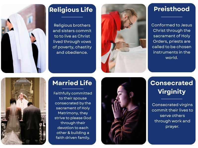 Through the sacrament of Baptism, we all have one calling in our lives: holiness. This means following Jesus to the best of our abilities. However, holiness will look different depending on one’s specific vocation. To discover the vocation of their life means being attentive and discerning of God’s movements. There are four distinct types of vocations in the Church.